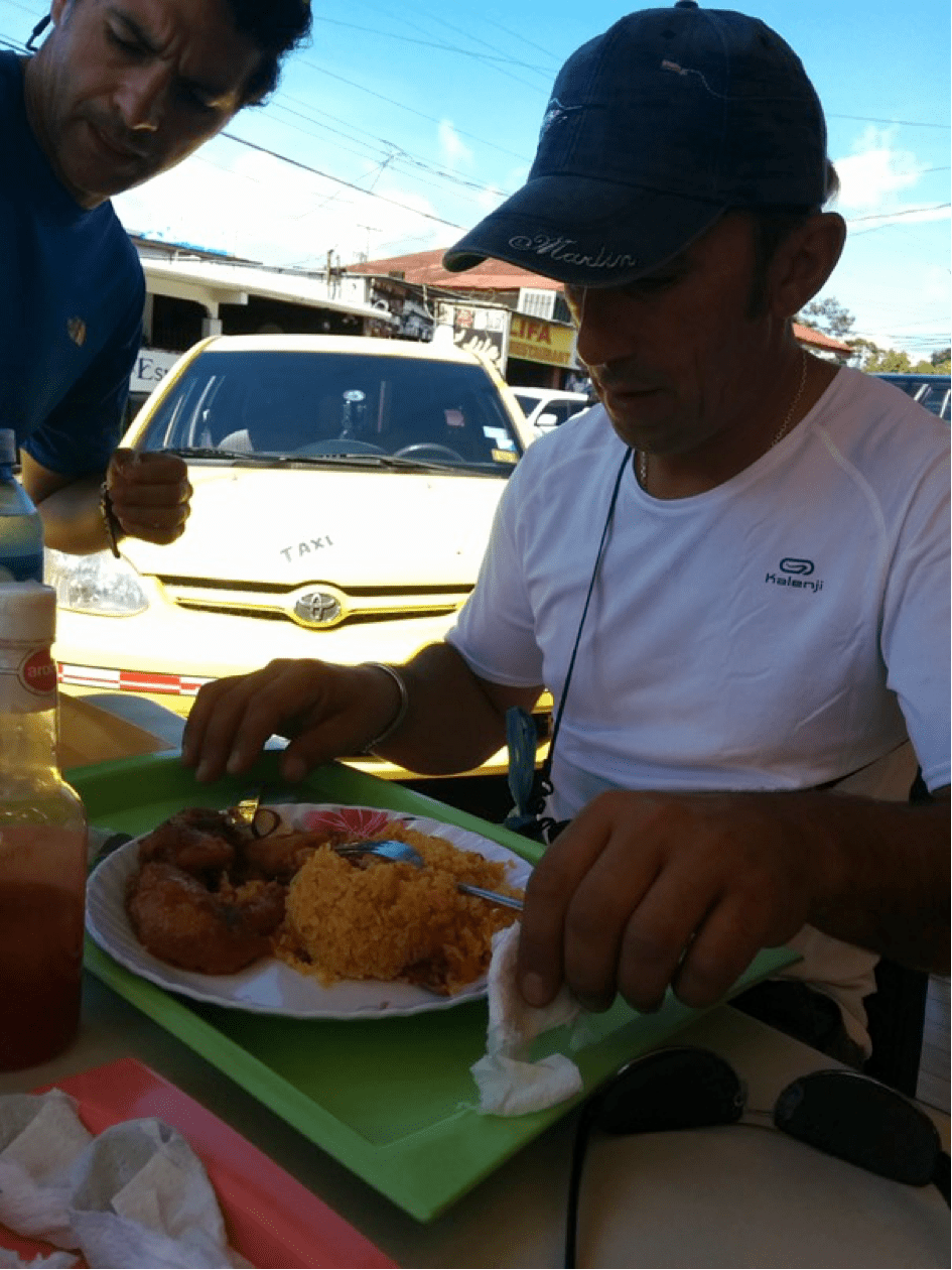 Le matin on file au magasin de pêche le plus proche, on est un peu déçus c’est les mêmes prix qu’en France, on achète quand même 2-3 trucs et on rentre profiter de la piscine, on fait nos valises et on descend pour le check out. Au bar on rencontre un vieil américain qui nous interpelle avec nos tubes, on parle un moment avec lui, c’est un pêcheur qui vit au Costa Rica, il nous dit que Chiriqui est le meilleur endroit au monde pour la pêche, Fifi est sceptique : « Laissez tomber c’est un amerlock il va nous vendre la messe », nous on est contents c’est bon signe ! On sort déjeuner dans un restaurant local plébiscité par les chauffeurs de taxi, on mange à peu près la même chose que dans notre routier de la veille mais c’est bon et le restaurant est propre et coloré.