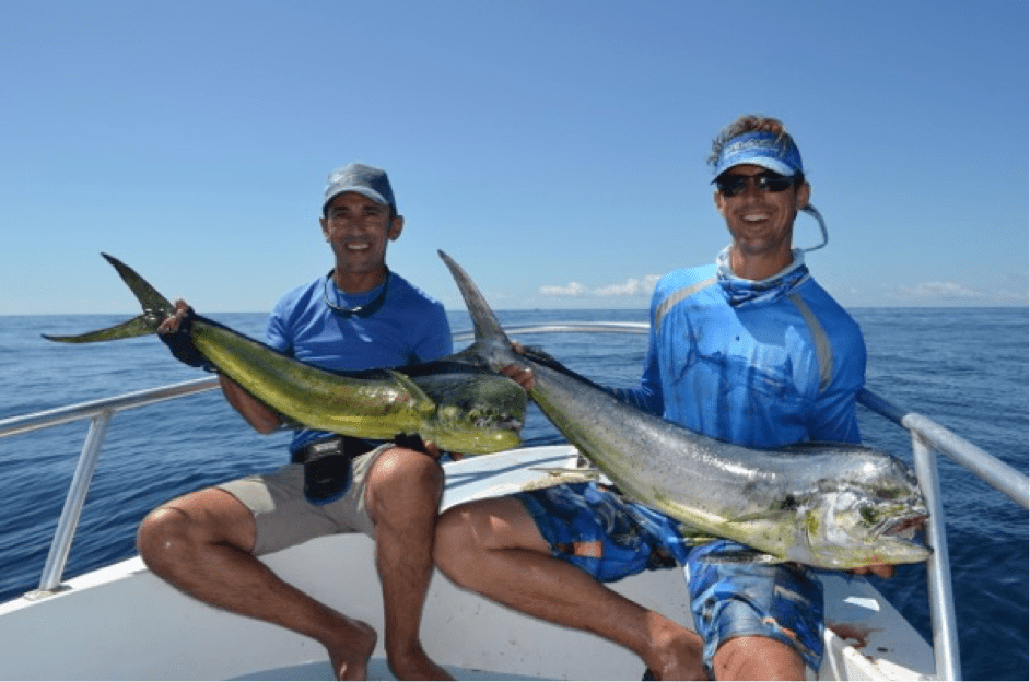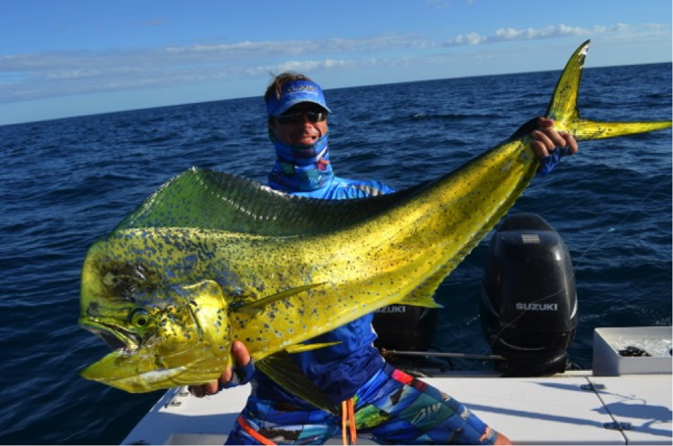 On se balade de spot en spot, c’est pas la folie mais on prend déjà beaucoup plus de poisson qu’a Santa Catalina et plus gros, Eric sortira notre premier et seul Rainbow Runner, on fait quelques carangues mais ce n’est pas la saison. Après avoir déjeuné sur le bateau nos Tupperware de pâtes aux poulets et le meilleur ananas qu’on n’est jamais mangé, on part sur un des spots d’Olivier pour jigger un peu car on s’est tous ramené avec des kilos de jig sans avoir encore eu la possibilité de les utiliser. Le Coach monte un Wheepy Vert de chez Hart qu’il a customisé avec un Calamar coloré sur l’assist. Le temps de faire 2-3 remontées, Boummmmm, le moulinet du Coach chante ! Il ne sent pas trop de résistance, au bout de quelques secondes on voit plusieurs grosses taches vertes remontées, c’est un banc de Coryphène qui suit leur congénère au prise avec le jig. Eric est d’une rapidité fulgurante et avant même qu’on est réagi il a déjà bondi de l’autre coté du bateau avec un stickbait rose et le met devant la gueule d’une autre coryphene qui le gobe instantanément, c’est le doublé, on hurle ! Fifi et moi tentons de faire de même mais c’est trop tard, on a manqué notre tour, un quadruplé de Coryphene ça aurait été beau surtout que le coach a fait la sienne au Jig ce qui n’est pas commun.