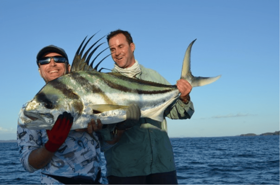 et on commence à lancer et des poissons remontent du fond voir ce qu’il se passe, des barras, quelques carangues, on a des suivis mais ça mord pas, soudain alors que Le Coach, Eric et moi même avons nos leurres tous près les uns des autres c’est l’attaque simultanée! Un banc de coqs nous attaque ! On arrive à voir 3 ou 4 crêtes sortir de l’eau, Eric et moi sommes pendus on hurle ! Au même moment c’est le vif qui part aussi, triplés de coq !! Olivier nous dit qu’il à jamais vu ça, a peine le temps de dire ça et c’est mon poisson qui se décroche, je suis dégouté, Fifi qui lutte avec le coq au vif perd aussi son poisson, je lui dis de continuer à ramener doucement puisque la dernière fois le coq a remordu mais cette fois-çi ça marche pas. Eric lui est bien accroché et après un super combat c’est tout heureux qu’il sort son 2ème coq en 2 jours, il aura aussi pris la plus grosse carpe, le tout avec ses sticks baits.