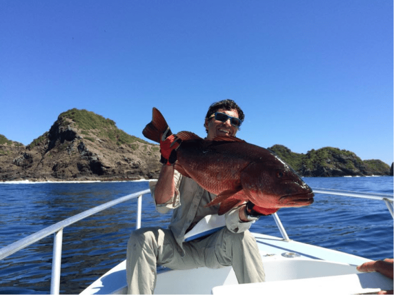 On arrive ensuite sur un premier Spot, On est là depuis 3 minutes et boum, le Catalina d’Eric fuse, il manque de tomber à la renverse sous la violence du choc, ces Croks valdinguent de parts et d’autres, le Coach essaye tant bien que mal de lui accrocher son baudrier mais rien à faire, heureusement Eric reprend rapidement le dessus et se met à pomper comme un malade, sa canne plie, cette fois çi c’est un gros poisson ! au bout de quelques minutes le poisson se rapproche de la surface, on aperçoit une grosse tache rouge, on hurle : « oh putain il est énorme », finalement une fois le poisson sur le bateau il ne dépasse pas les 20 kilos mais la satisfaction est là, on a attrapé notre premier vrai poisson du Panama, Eric à le sourire jusqu’aux oreilles et nous aussi, je suis heureux comme si je l’avais pris moi même, on aura au moins une photo a montrer à notre retour, on se sauve du capot.
