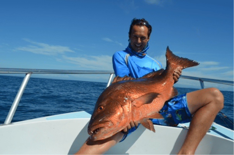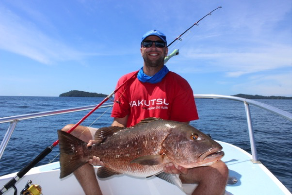 On est là depuis moins de 5 minutes et Boum ! Premier départ sur mon Roosta Popper, j’hurle j’ai enfin un poisson qui à l’air de ressembler a quelque chose, tout le monde s’arrête de pêcher et attend avec impatience mon « monstre ». Après 10 secondes de combat je sens bien que ça pèse pas bien lourd, je vois une tache rouge sous l’eau, peut être mon premier cubera ? Finalement je sors un poisson rouge certes mais qui fait même pas 500 grammes, tout le monde est mort de rire et Le Coach me charrie en me disant« ah il est beau ton Vivaneau », il croit pas si bien dire on apprendra plus tard qu’il s’agit d’un « Mangrove Snapper » c’est à dire un Vivaneau des mangroves en Français !