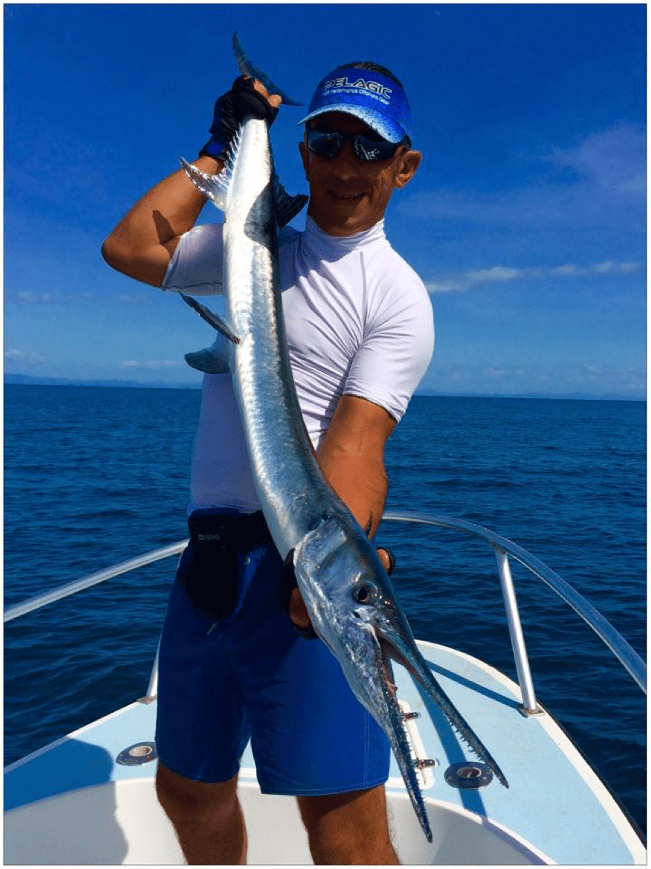 Après 20 minutes de navigation, Jean Luc nous dit d’armer nos cannes, on arrive sur zone. Les eaux sont foncées car il a beaucoup plu les jours précédents. Ce n’est pas top mais on se dit que nos poppers vont réveiller tout ce beau monde. Fifi à la première touche au bout de quelques minutes avec son Feed Popper, un Sierra Mackerel (maquereau du Pacifique), il râle mais nous on est content car on ne connaît pas cette espèce et c’est le début de l’exotique pour nous. Quelques minutes plus tard j’ai ma première touche avec mon Popper rouge et blanc Jet de Williamson, ça sera une petite orphie, je me demande comment un poisson si petit peut s’attaquer à un leurre si gros. De tout le séjour l’orphie sera notre poison (à défaut de poisson), elles sont super voraces, ont des dents tranchantes et un bec long. On en a chez nous mais celles-ci n’ont rien à voir !