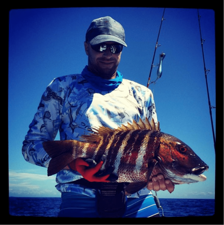 Arrivé sur un autre spot je mets un corinuha en vif sur ma canne à Jig(une Yakutsu Cenitz 50 lbs), je pose la canne et je commencer à popper. Au bout de 5 minutes olivier me dit : « poisson poisson » !! Je donne ma canne à Fifi et me jette sur la canne, boum c’est une petite pasteque mais ça tire, je pompe tranquillement, le poisson est retourné, apparaît un joli petit Roquéro de la famille des Pargo (Pagre) comme la Carpe Rouge, il est pas gros mais il a englouti la carangue d’une bouchée !