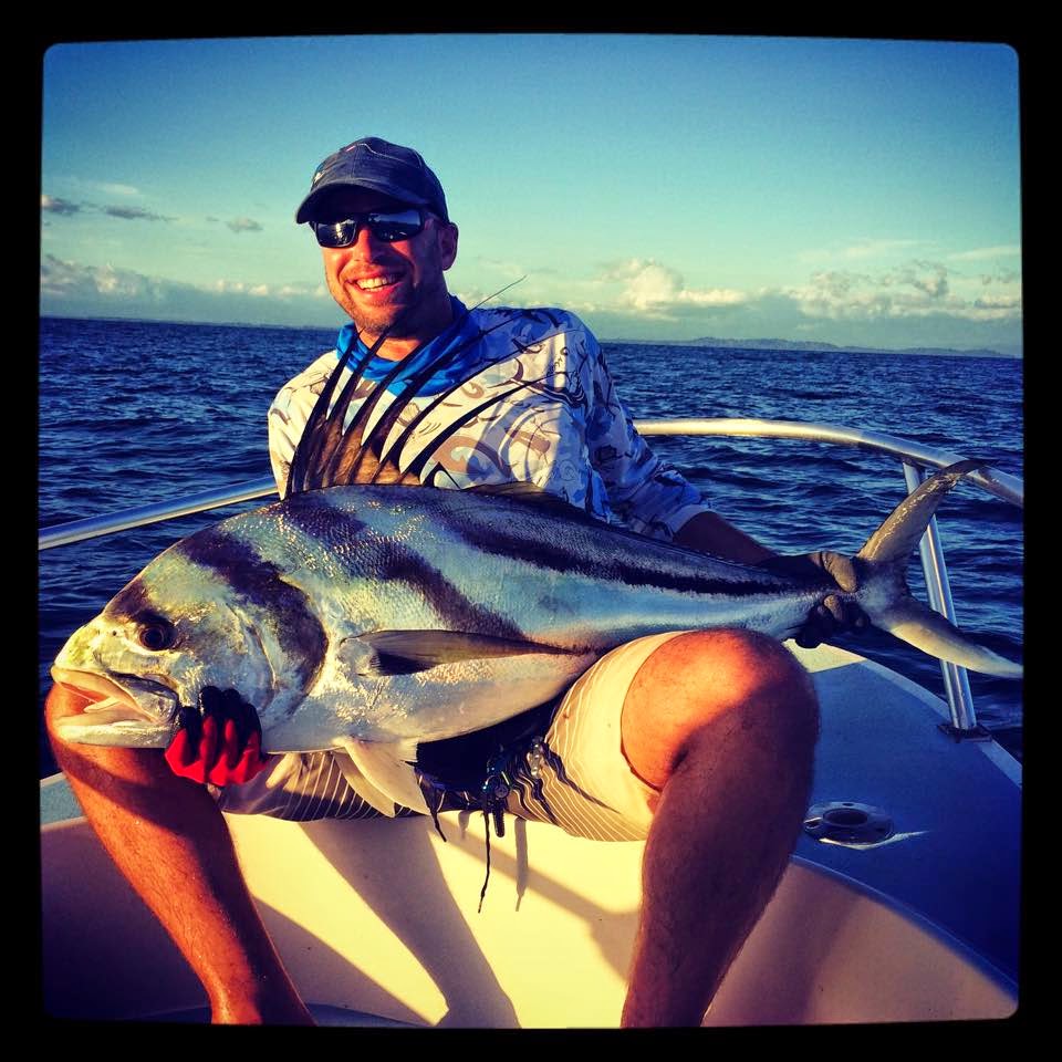 A 6H45 nous partons cannes à la main de la maison d’Olivier, nous marchons 50 mètres et un portail s’ouvre sur un grand champ avec des hangars, on hallucine tous de la qualité des bateaux qu’on voit ici, on est dans la pampa mais les installations sont top, au bout de la marina, la mise à l’eau et un ponton avec un des bateaux d’Olivier « Le Jackson », c’est le jour et la nuit par rapport a ce qu’on a eu avant, 9M, 2X110cv, Vivier et Tuna Tubes intégrés des portes cannes de partout « Now we are talking ! ». On sort de la lagune, les eaux sont entourées de Mangrove et Olivier nous explique qu’ici on peut pêcher le Snook ou même des grosses raies (denuit et à l’appât). La première chose qu’on fait ici c’est qu’on remplit le vivier ! On sort des mitraillettes et c’est parti, on fait des corinuha et je sors même une petite carangue jaune.