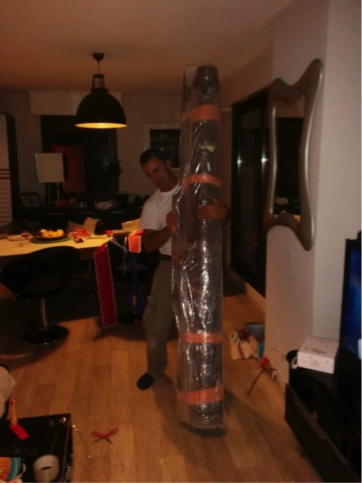 Nous osons même le pari de scotcher et emmailloter nos 2 tubes de papiers bulle pour n’avoir qu’un seul bagage. Le pari sera réussi 16 Cannes dans 2 tubes !